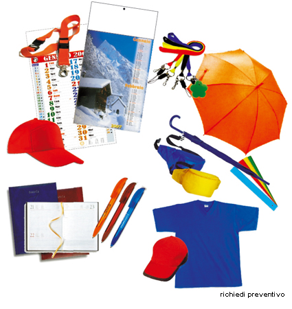 Ricerca, sviluppo,stampa, commercio dei più svariati articoli promopubblicitari anche speciali su richiesta: gadget, novità, abbigliamento vario, dai cappellini agli ombrelli, dalle tshirts alle felpe alle giacche, borse e maglie sportive, gagliardetti, striscioni, targhe, adesivi, penne a sfera, pins,badge, bandiere, calendari, agende, shoppers, biglietti da visita, timbri, abbigliamento lavoro, vetrofanie vetrine ed auto, articoli ufficio, auto, regalo, casa, articoli per concessionarie auto, moto, vendita all'ingrosso per le aziende ma anche al minuto per privati, articoli per ogni evenienza o ricorrenza.